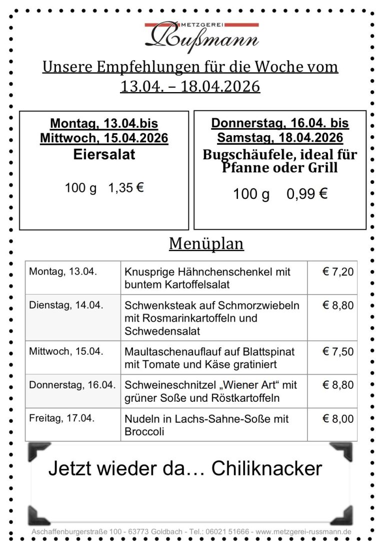 Unsere Metzgerei wurde im Jahr 1925 gegründet und wird bereits in der 3. Generation geführt! Wir, die Brüder Leonhard und Rudolf Rußmann, haben das Geschäft im Jahr 1998 von unserem Vater Ernst übernommen. Metzgermeister Leonhard Rußmann hat in der Wurstküche sein Reich und ist verantwortlich für die Produktion der Wurstwaren. Rudolf Rußmann, gelernter Metzger- und Küchenmeister trägt mit seiner Frau Sabine die Verantwortung für Verkauf, Herstellung der Feinkostspezialitäten und das Catering, das weit über die Grenzen Goldbachs beliebt ist.